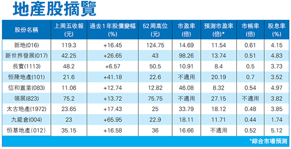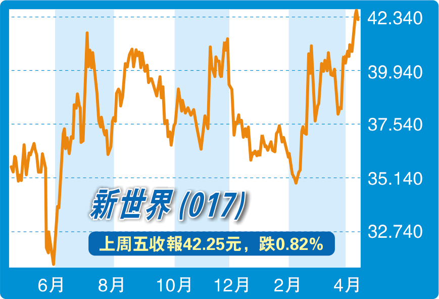 溫傑亦看好新地的投資前景。他指,新地作為本港大型地產公司,收入盈利有保障,建議可待新地股價有所回落,於110元買入,目標價是130元,止蝕價為買入價的10%。同時,他看好新世界發展,因新世界發展旗下K11集團銷售額去年下半年增長45%,其中香港K11去年下半年銷售額增長56%,遠遠超越香港零售銷售的整體表現。他建議,新世界發展的買入價為37至38元,目標價為41.5元,止蝕價為買入價的10%。