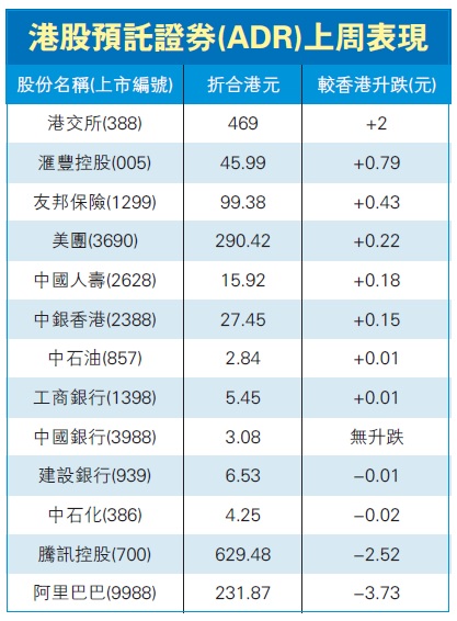 受惠美國近日公布的經濟數據理想,及重磅股業績普遍優於市場預期所帶動,道指及標指雙雙創新高。道指周五(16日)曾升至34256點新高,最終收報34200點。ADR方面,港股ADR指數重返29000點以上,收報29020點,升51點或0.18%。滙豐控股(005)ADR折合港元收報45.99元,升0.79元或1.75%;中國人壽(2628)ADR折合港元收報15.92元,升0.18元或1.12%;中石化(386)ADR折合港元收報4.25元,逆市跌0.02元或0.43%。