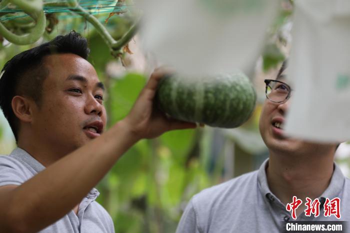 圖為黃惠銘和合夥人查看南瓜生長情況。蔣啟明攝
