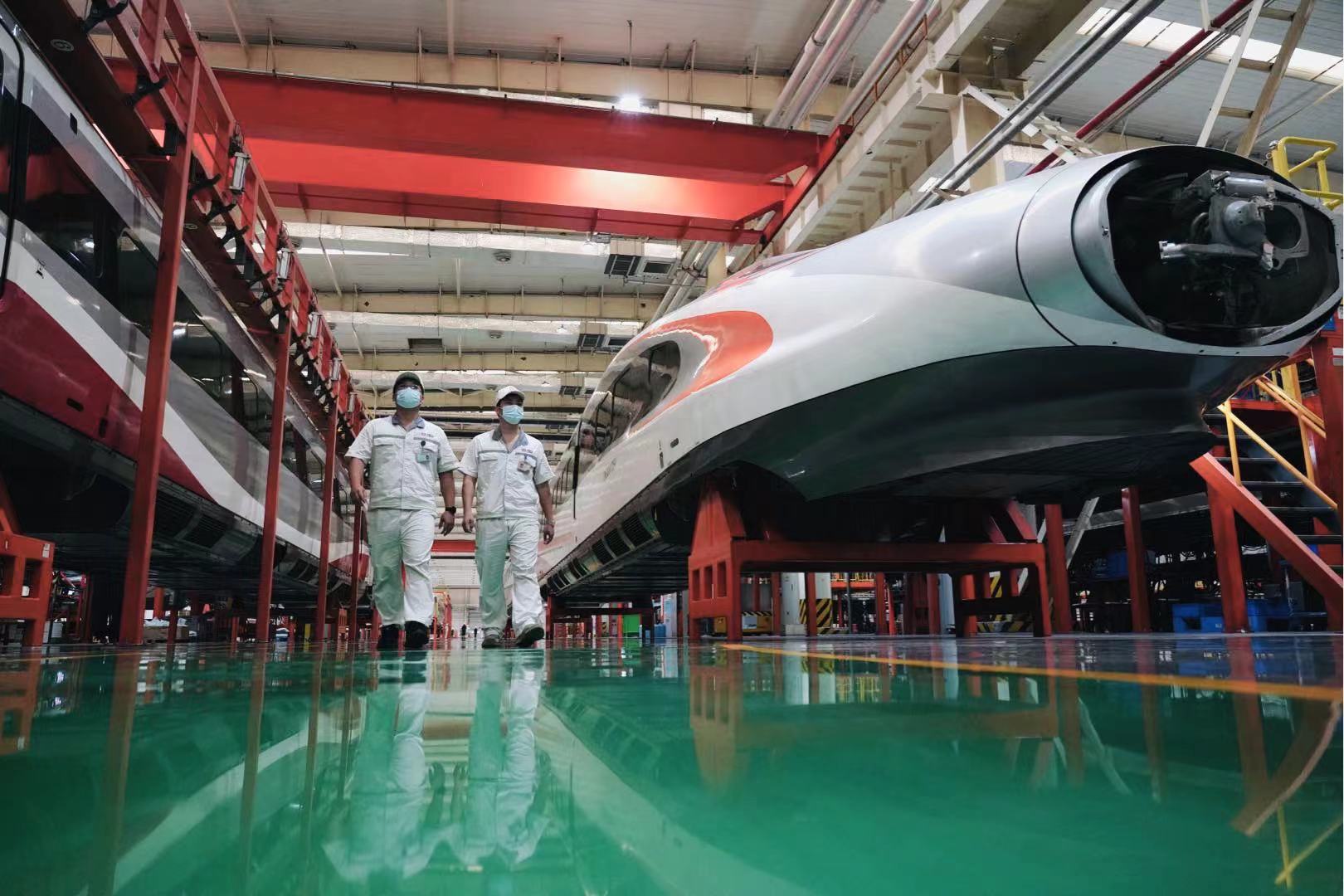 在廣東江門火車站一側的中車廣東軌道交通車輛有限公司廠房內,來自香港、深圳、廣州等地的地鐵車輛在偌大的車間一字排開等待維護與檢修;總裝車間內,數節城際列車車廂即將下線發往各地。廠區附近聚集了十多家軌道交通上下游企業,與中車廣東軌道交通開展密切合作。