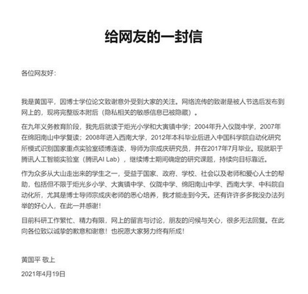 黃國平今日通過深圳商報獨家發文,講述自己成長經歷,並向網友留言和朋友關心表示歉意和謝意。他在文中稱,網絡流傳的致謝是被人節選後發布到網上的,現將完整版本附後(私隱相關的敏感信息已被隱藏)。在黃國平附上的致謝完整版本中,已將相關人員姓名隱去。