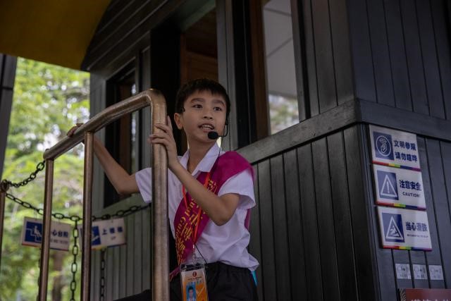 江門五邑華僑華人博物館內負責志願講解工作的小小雙語導賞員。人民日報記者 張武軍攝