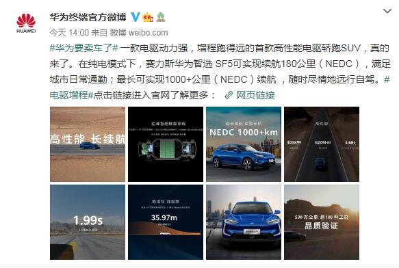 4月19日,華為終端官方微博表示,華為要賣車了,首款車為「賽力斯華為智選SF5」,是一款增程式電動轎跑SUV。其電驅、車機與音頻系統均由華為提供。