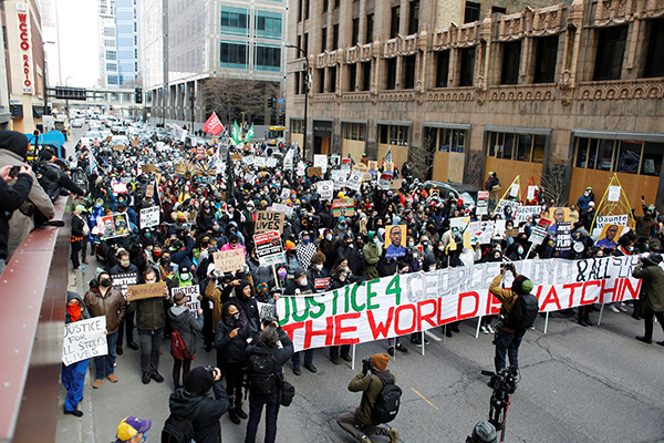 示威者在明尼阿波利斯市中心遊行,要求為弗洛伊德伸張正義。路透社