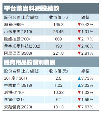 其他體育用品股個別發展,21日創新高的李寧(2331)一度回吐5.5%,低見59.5元,收報62元跌1.6%。特步國際(1368)跌1.8%;361度(1361)逆市飆3.7%;中國動向(3818)升3%。