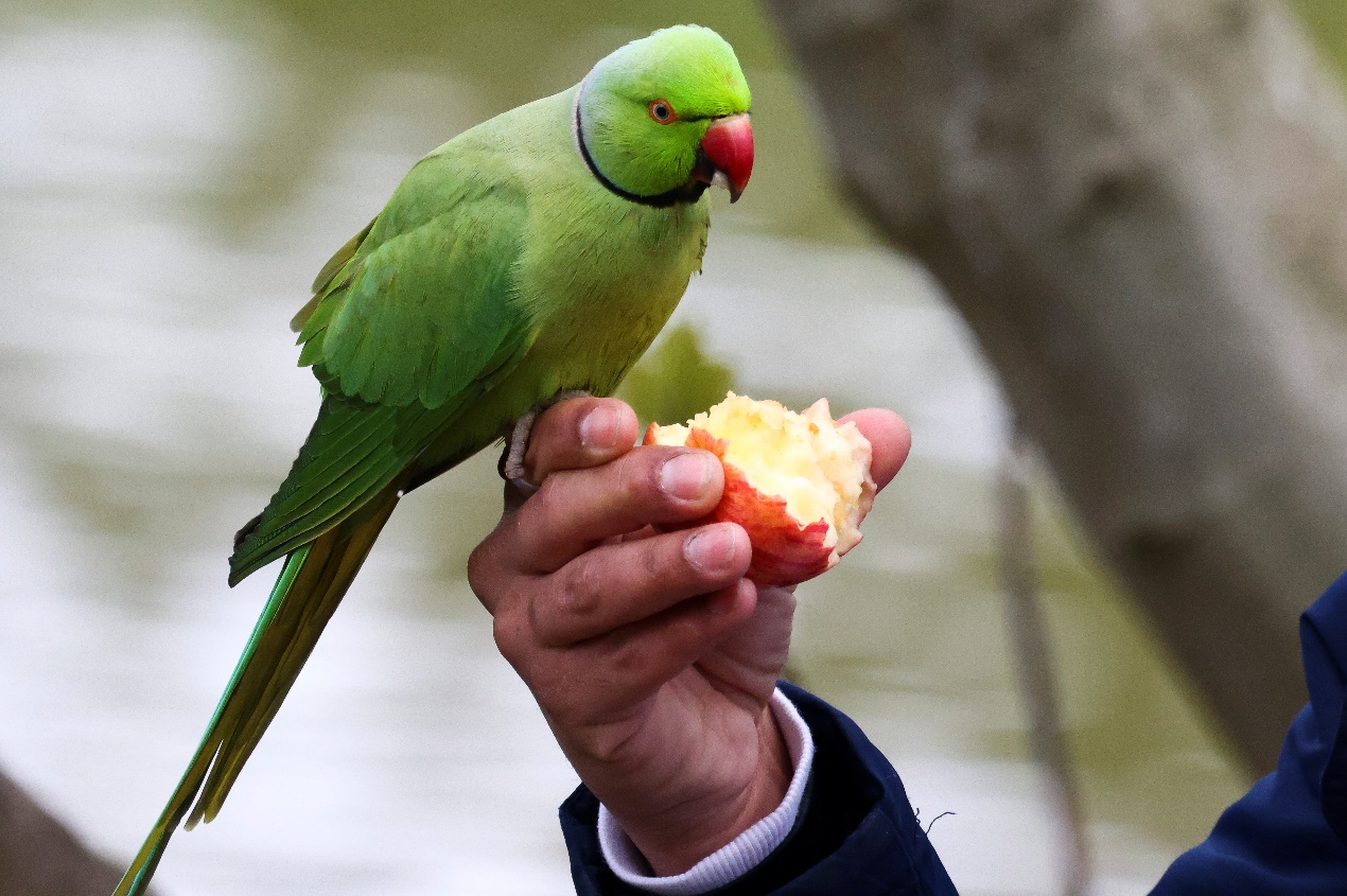 當地時間4月15日,在英國倫敦,一名男子在公園給鳥兒餵食。