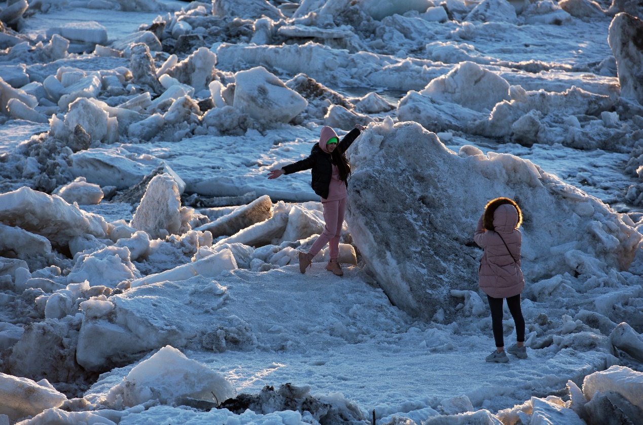 當地時間4月17日,俄羅斯西伯利亞托木斯克的托木河上開始出現大塊漂流的浮冰。人們跑到冰上去拍照。