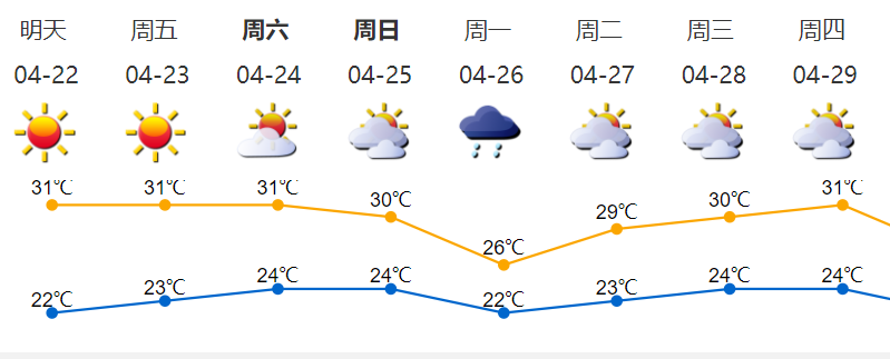 22-25日多雲到晴天,氣溫上升,中午前後體感較熱,22日氣溫22-31℃;