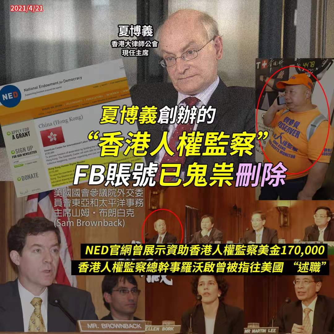 吳秋北指出,夏博義來港創辦「香港人權監察」,《大公報》便揭發該組織的資金來源:「香港人權監察」早在1995年起每年收受NED撥款,由最初1995年到2003年,每年獲的資助額由20多萬到40多萬港元不等;2004年起NED的資助額每年急升至130多萬港元;直至2013年被傳媒揭發收NED資助,才轉趨低調。不過,有紀錄顯示2018年「香港人權監察」再獲NED約70萬港元撥款。