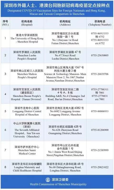 除上述人員之外的其它台灣同胞,定點至「在深外籍人士及港澳台同胞新冠病毒疫苗定點接種點」接種,全市共設置了8個接種點。