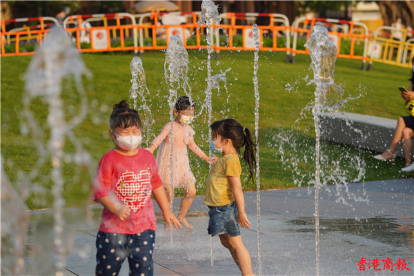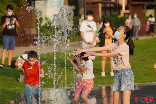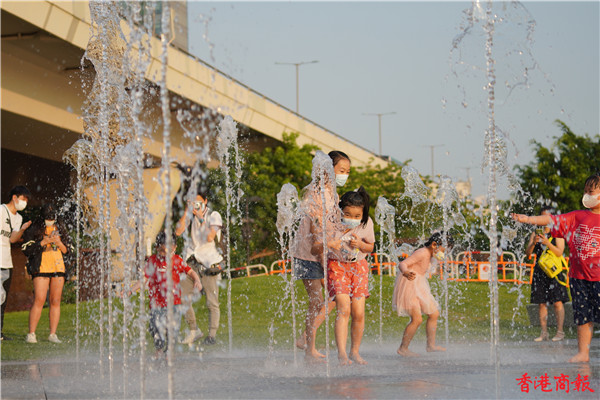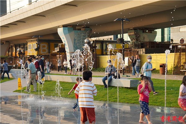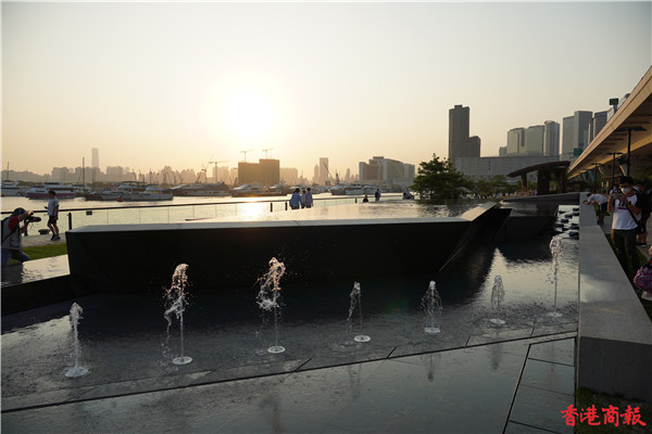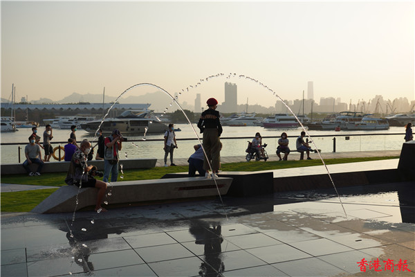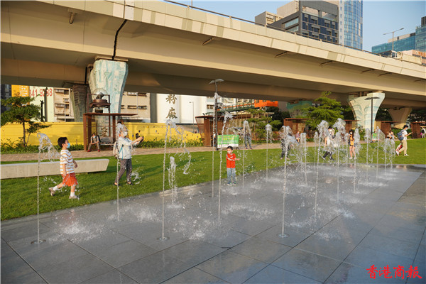 觀塘區議會社區重點項目計劃,佔地約3700平方米,耗資逾5000萬元建造的觀塘海濱音樂噴泉正式啟用。音樂噴泉以電腦程式控制水柱,水柱會配合名曲旋律舞動,吸引不少市民前來打卡。音樂噴泉項目共有3個互動嬉水區,各嬉水區內設有感應裝置,當感應到遊人接近時,不同噴咀會噴出形態各異的水柱。(馮俊文攝)