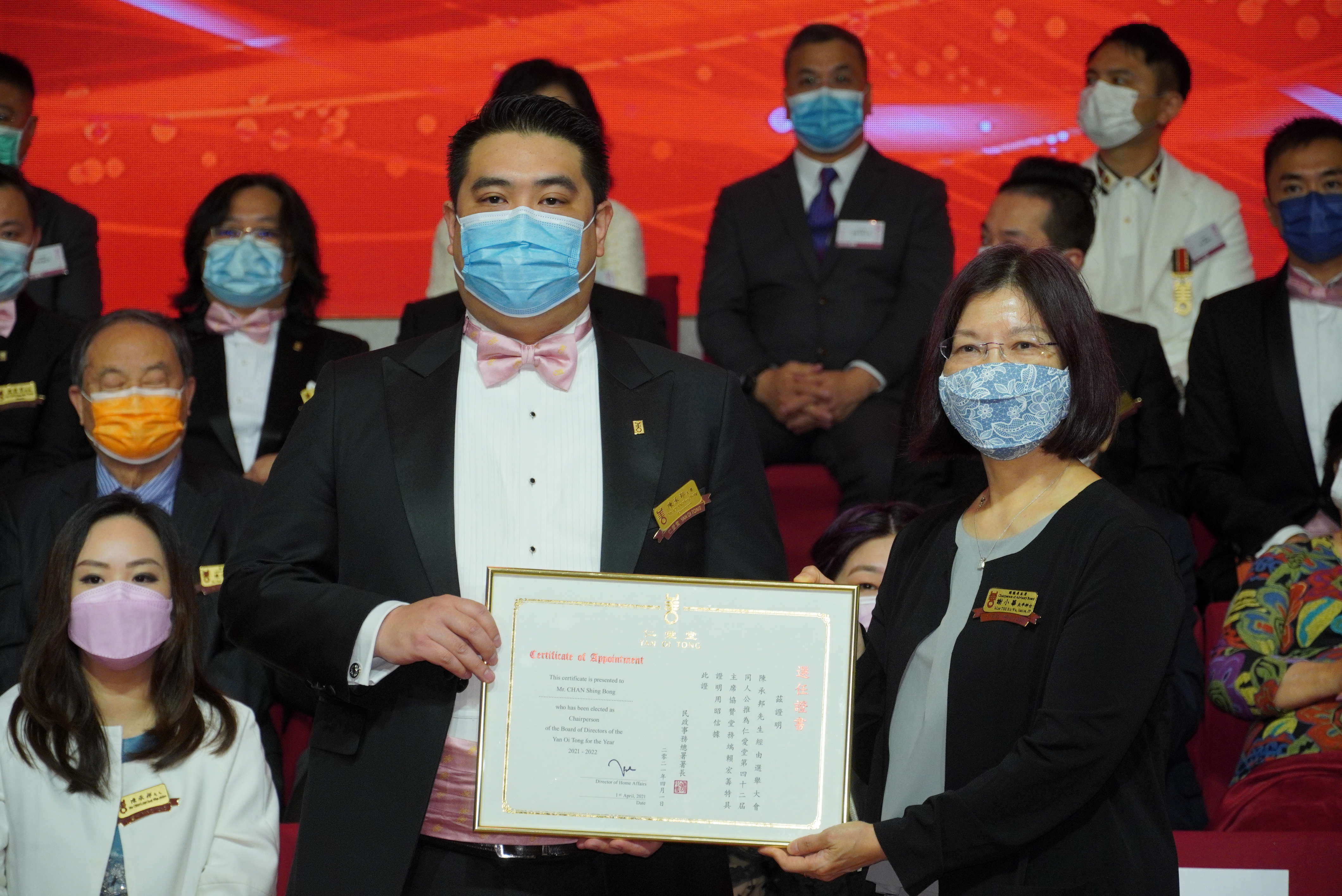 徐英偉、陳肇始及羅致光在致辭中均表示,仁愛堂董事局過去一年凝聚社會仁愛力量,精益求精,推出嶄新的服務計劃,造福廣大市民。疫情來襲,社會各階層都面對不同的困難,仁愛堂傾力支持特區政府的抗疫工作,積極向有需要人士送暖紓困,功不可沒。祝願仁愛堂百尺竿頭,更進一步!民政事務總署署長謝小華向新屆董事局成員頒發選任證書。