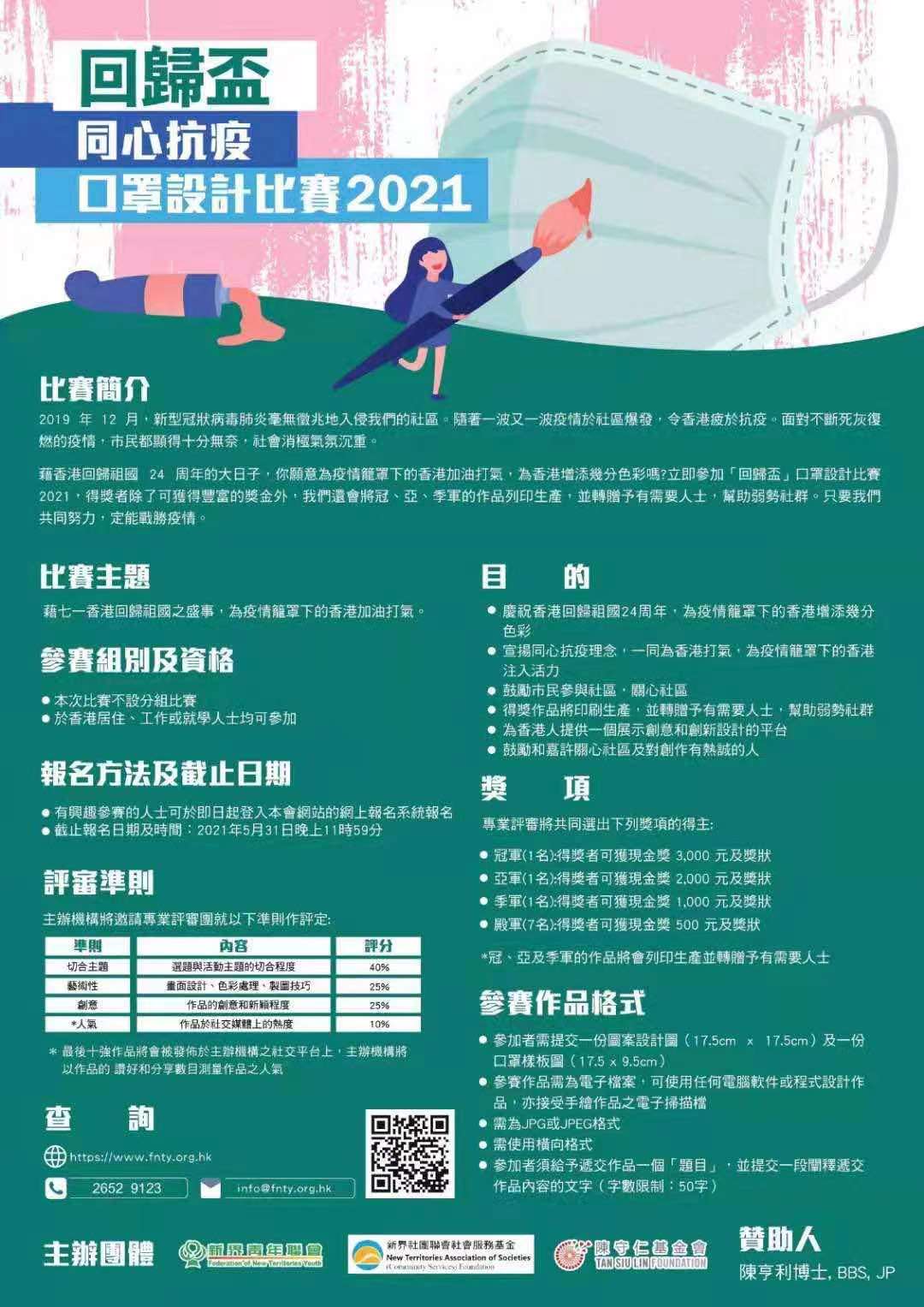 新冠肺炎疫情持續超過一年,香港先後面對四波疫情爆發,令社會疲於抗疫。面對不斷死灰復燃的疫情,香港市民都顯得十分無奈,導致社會消極、氣氛沉重。藉香港回歸祖國24周年的大日子,由新界青年聯會、新界社團聯會社會服務基金、陳守仁基金會主辦,陳亨利博士贊助的「回歸盃同心抗疫口罩設計比賽2021」現正接受網上報名,歡迎市民踴躍參加,一齊為疫情下的香港增添色彩。