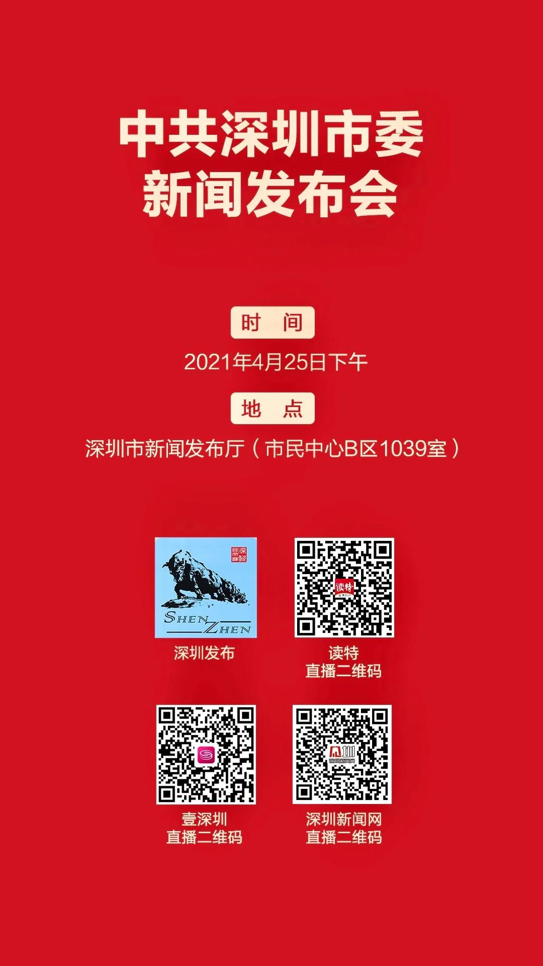 4月25日,中共深圳市委將舉行新聞發布會,讀特、深圳新聞網、壹深圳等平台將作直播,敬請關注。