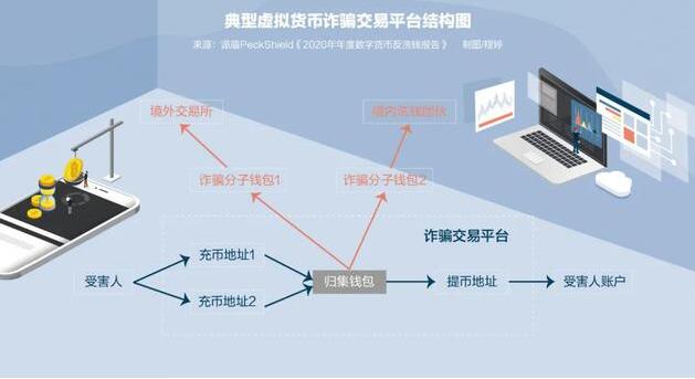 PeckShield告訴《中國新聞周刊》,2020年,因詐騙案件造成的損失共有31.3億美元。這類案件往往以投資名義讓受害人先到正規交易平台用現金購買虛擬貨幣,再誘騙對方將已買的虛擬貨幣轉移至詐騙分子指定的虛假平台或地址。一旦轉移,虛擬貨幣會迅速通過洗錢團夥處理或者流入境外交易所,為追回資金造成極大的難度。詐騙類安全事件已經成為區塊鏈世界最大的安全威脅。