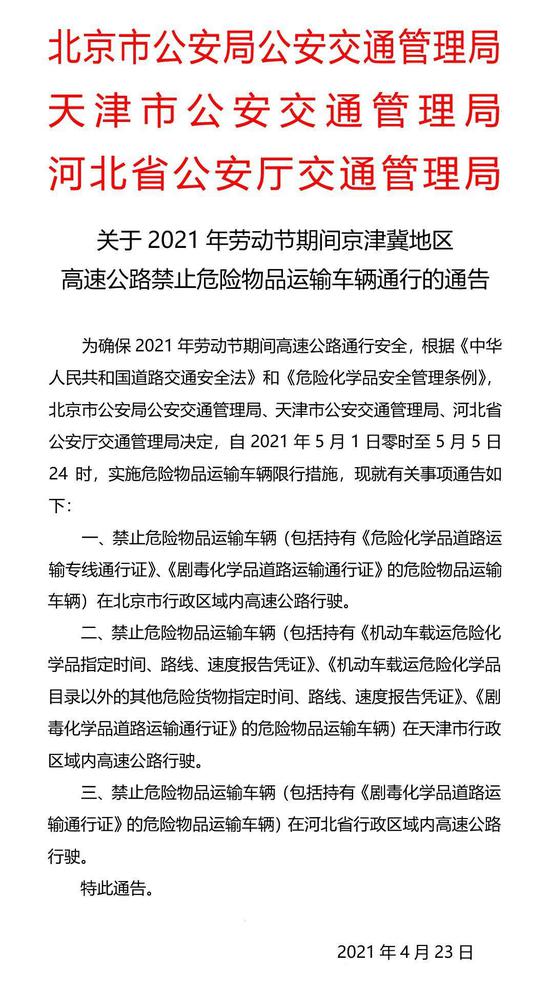 為確保2021年勞動節期間高速公路通行安全,根據《中華人民共和國道路交通安全法》和《危險化學品安全管理條例》,北京市公安局公安交通管理局、天津市公安交通管理局、河北省公安廳交通管理局決定,自2021年5月1日零時至5月5日24時,實施危險物品運輸車輛限行措施。