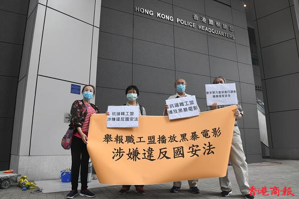 有請願人士今早到警總請願,舉報職工盟本月初在其社交媒體中公告:會於放映《理大圍城》,《佔領立法會》和《中大保衛戰》等「黑暴」紀錄片,並不時舉辦非公開放映等活動,據悉他們的首場已於4目11日放映,而上周六及本周六更放映隨後的兩場。