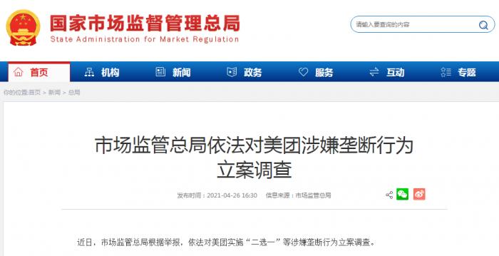 市場監管總局公布,近日,市場監管總局根據舉報,依法對美團(03690)實施「二選一」等涉嫌壟斷行為立案調查。成為繼阿里巴巴 (09988) 後,另一被點名調查「二選一」行為的科網企業。