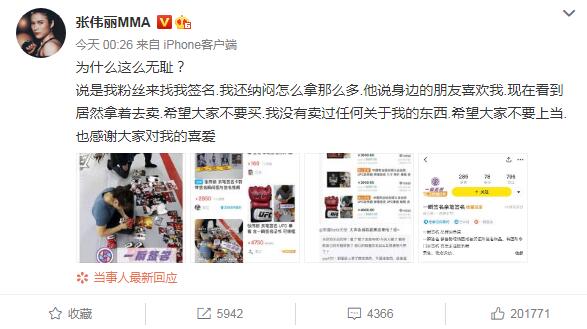 張偉麗寫道:「為什麼這麼無恥?說是我粉絲來找我簽名,我還納悶怎麼拿那麼多,他說身邊的朋友喜歡我,現在看到居然拿著去賣。希望大家不要買!我沒有賣過任何關於我的東西!希望大家不要上當,也感謝大家對我的喜愛。」