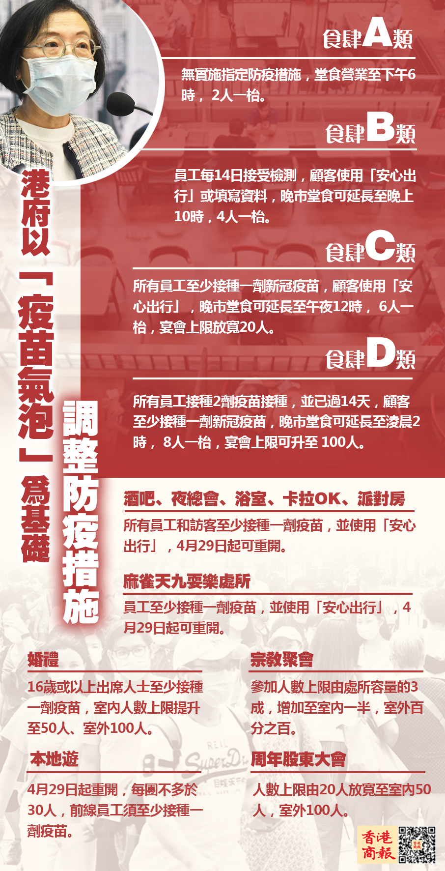 本港4人限聚令等防疫措施將於明日屆滿。食物及衞生局局長陳肇始今日(27日)下午宣布,因應追蹤能力加強及提高檢測能力,由4月29日至5月12日以「疫苗氣泡」為基礎調整防疫措施,食肆将採用ABCD 4種营业模式;酒吧、卡拉OK等处所可重开,但需配合接種疫苗。