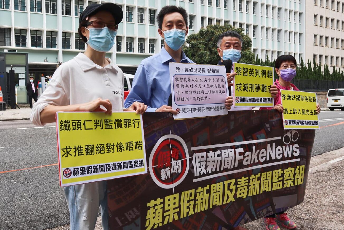 今日上午,「蘋果假新聞及毒新聞監察組」召集人傅振中和另外3人到達中環律政中心門外請願。傅振中指,反中亂港頭目黎智英,早前分別因組織和參與前年8.18和8.31兩宗非法遊行,遭判監共14個月,另9名同案被告亦在該兩宗案罪成,分別被判監或緩刑。其中李柱銘和何俊仁獲緩刑,但二人與仍有連串官司的黎智英卻玩弄司法程序,上訴減刑。