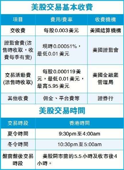 其他收費還有券商平台收取的佣金,以及美國交易所和監管機構的收費,當中包括證監會費(沽售時收取,收費每季不同,現時為0.00051%)、交收費(約每股0.003美元)、交易活動費(沽售時收取,約每股0.000119美元)。