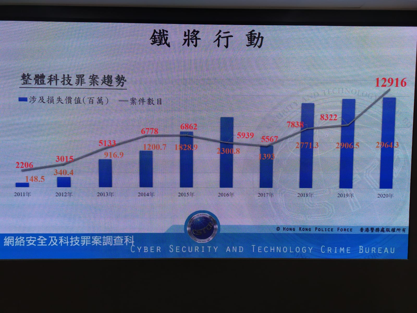 網絡安全及科技罪案調查科網絡情報組警司張天樂今日(30日)表示,本港在過去10年科技罪案逐年上升,由2011年的2206宗上升至2020年的12916宗,損失金額上升19倍。