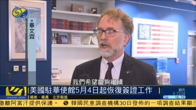 美國駐華大使館領事處總領事畢文霖:「我們將於5月4日(周二)在北京、上海、廣州和瀋陽開始對學生進行面簽,我們希望能夠繼續對他們進行面簽,並在他們所有人旅行之前完成面簽。」