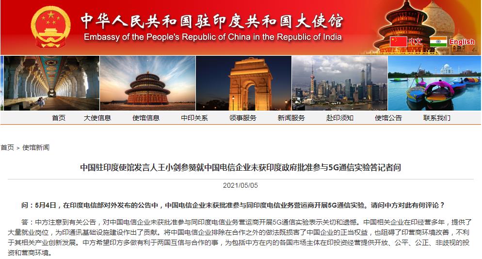 中國駐印度大使館發言人王小劍5日在記者會上表示,中方對中國電信企業未獲批准參與同印度電信業務營運商開展5G通信實驗表示關切和遺憾。