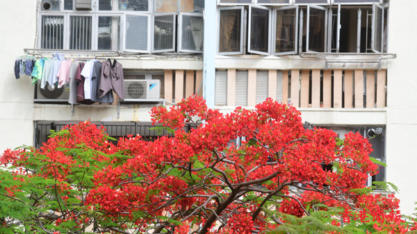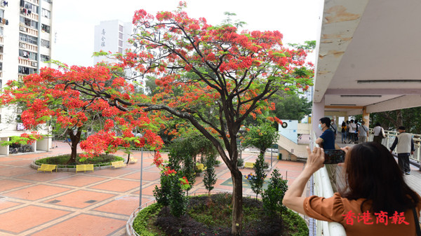 花多眼亂也是這個禾輋邨的一大特色,近日正值邨內的賞花期,邨內有超過二十多棵宮粉羊蹄甲、凤凰木等,都開得鮮艷燦爛,璀璨耀眼,就如櫻花般盛放。不少上年紀的居民、在附近工作的沙田人,也會來湊湊熱鬧如「賞櫻」般,令自己開心之外,也感受大自然變幻及步入初夏的美態。(崔俊良攝)
