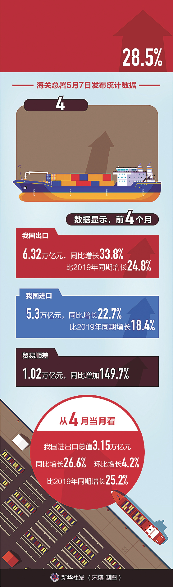 據海關統計,按人民幣計價,今年前4個月,中國進出口總值同比增長28.5%,比2019年同期增長21.8%。其中,出口同比增長33.8%,比2019年同期增長24.8%;進口同比增長22.7%,比2019年同期增長18.4%;貿易順差1.02萬億元,同比增加149.7%。
