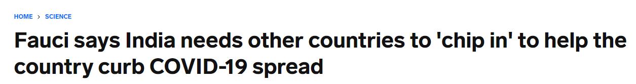 福奇還表示,像美國這樣的國家必須加緊幫助印度處理疫情,例如向疫苗生產商施壓,要求其向印度分發疫苗。他指,「印度不能僅從內部獲得資源,還需從外部獲得資源,這就是為什麼其他國家需要介入為印度提供疫苗的原因」。