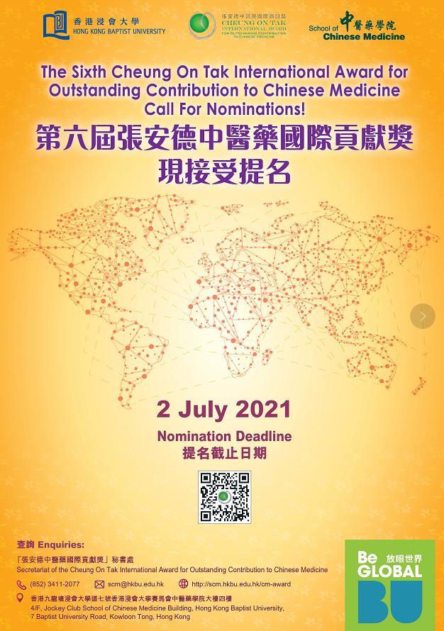 浸大透露第六屆「張安德中醫藥國際貢獻獎」現已開始接受提名,截止提名日期為7月2日。