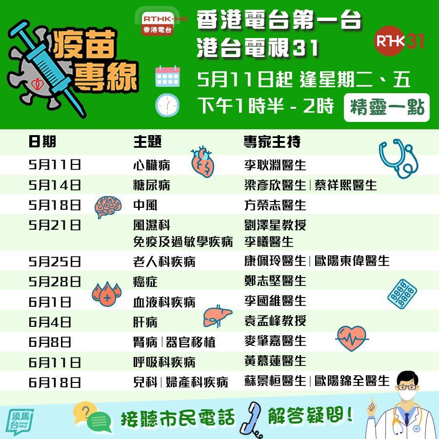 醫管局及大學醫學院多名教授和臨床專家今日(11日)起,逢星期二、五下午1時30分至2時會在香港電台第一台、港台電視31《精靈一點》疫苗專線擔任專家主持,一連11集講解患有不同專科疾病的人士在接種新冠疫苗時應注意的事宜,並會接聽電話,解答聽眾疑問。
