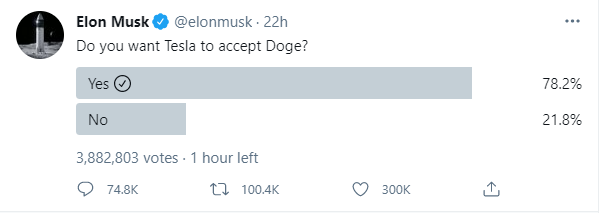 這個問題是以推特調查的形式提出的。幾天前馬斯克稱狗狗幣是「騙局」,導致其價格大跳水。