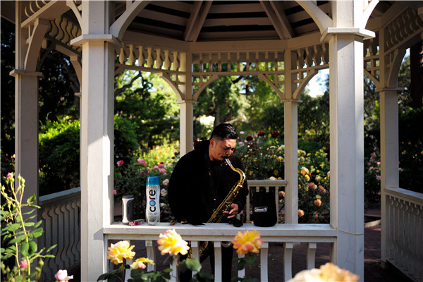 5月11日,一名男子在美國加利福尼亞州北部聖馬特奧鮮花盛開的中央公園裏吹薩克斯。