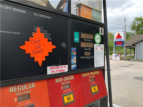 近日因輸油管道遭黑客襲擊導致美国东部汽油供應緊張,5月11日,北卡羅來納州韋恩斯維爾的一個加油站油泵上写着「汽油用光」。