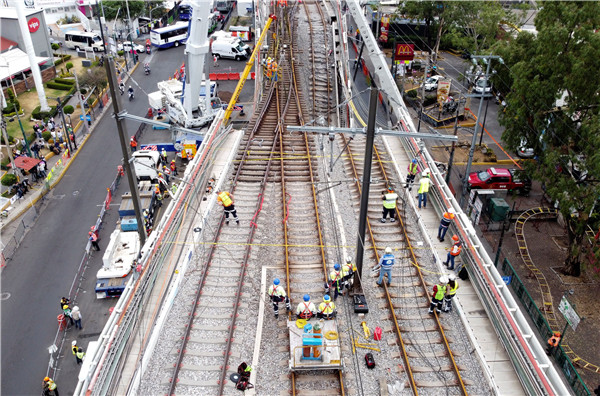 5月11日,墨西哥墨西哥城,來自不同公司的人們在地鐵立交橋部分坍塌的現場忙於修复工作。