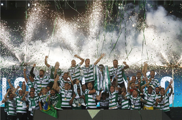 5月11日,葡萄牙里斯本競技隊的塞巴斯蒂安·科茨和隊友們在贏得西甲聯賽冠軍後慶祝勝利。