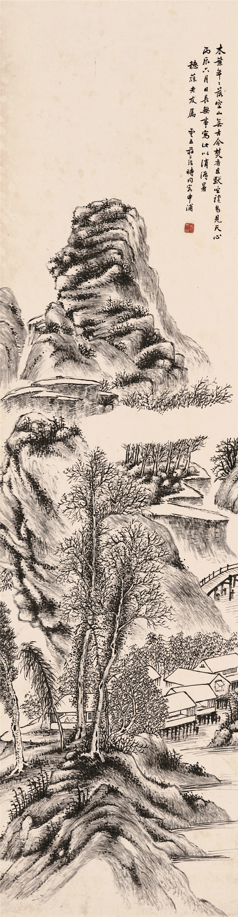 這是一幅繆潤生效仿明代陸師道畫風的作品。陸師道(1510-1573),字子傳,號元洲。師從文徵明十四年,尤工小楷、古篆,全得麻姑壇法,而以色彩傅之,遂為一時書家冠。此畫有實有虛、剛柔相濟、張馳有度,既渾然一體又層次分明,在看似縱情恣肆的自由揮灑中始終恪守著嚴謹而精微的架構,筆墨間洋溢著作者對幽居山野,「兩耳不聞窗外事,一心唯讀聖賢書」的安寧清淨生活之嚮往。(文:蕭芬琪)