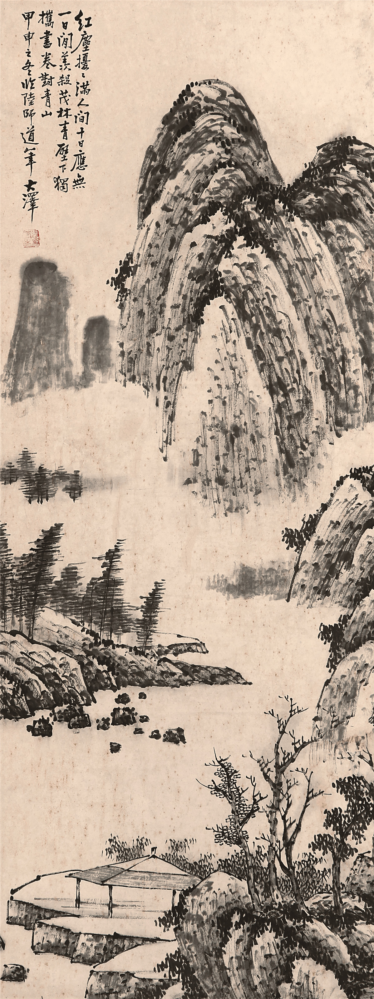 中國古代文人將山林看作是遠離喧囂紅塵的精神棲息之地,但是真實的山水不可能脫離塵世,山水仍然是紅塵中的山水,因此文人筆下的山水就成了文人聊以自慰的、修禪悟道的精神家園,其固有的世俗性一面消失了,山水畫就成了文人改造過的理想境界。正如董其昌《畫旨》所言:「非以畫為寄,以畫為樂者也。」中國畫的題識中往往可見畫者寄情於山水筆墨間,抒懷達意,聊以自樂。