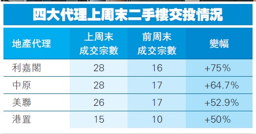 樓市持續暢旺,綜合利嘉閣地產分行網絡數據,在過去的周末日(5月15至16日)十大指標屋苑累錄28宗二手成交個案,較前周末(5月8至9日)的16宗增加12宗或75%,為近12周新高。