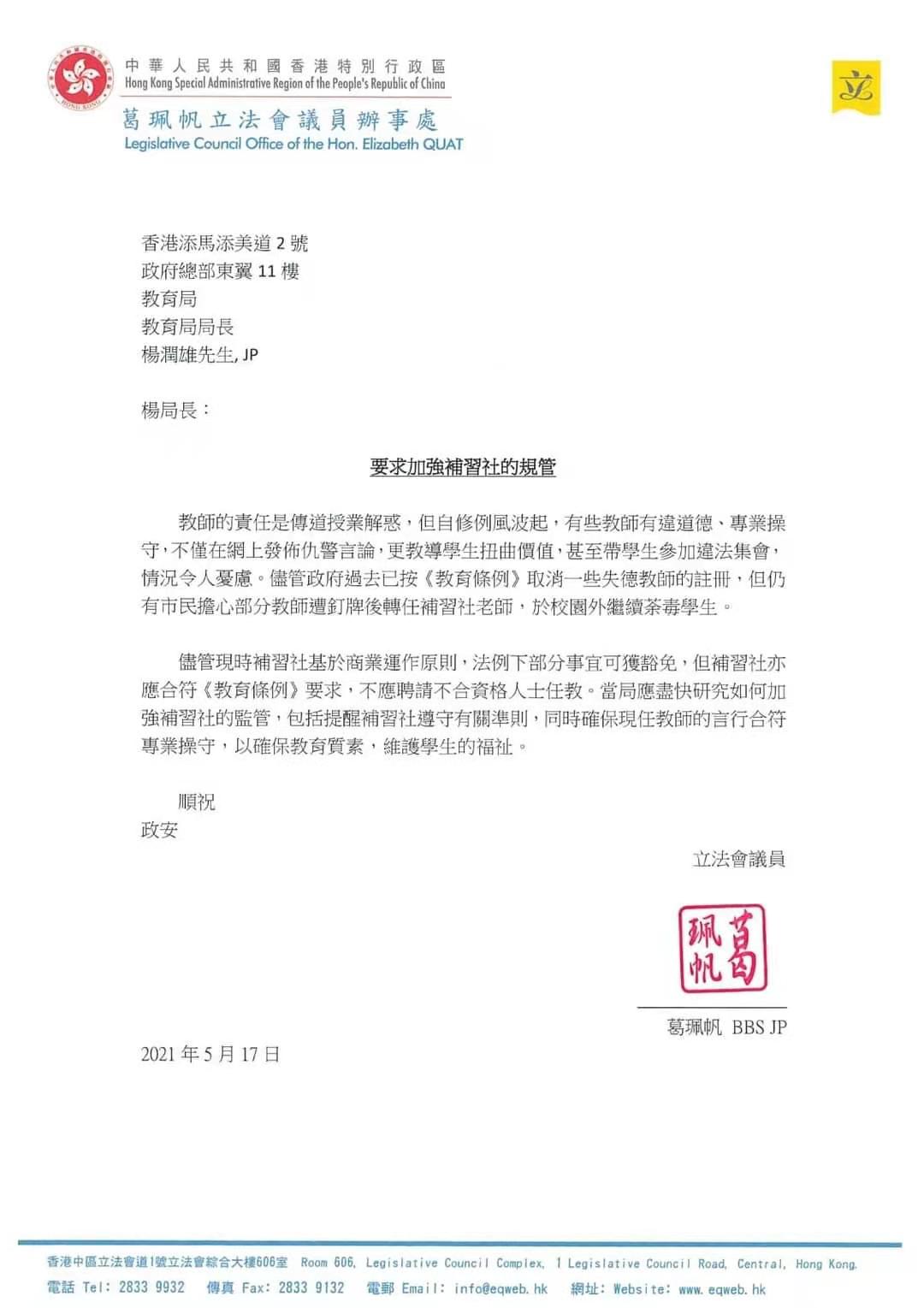 鑒於事件影響深遠,民建聯立法會議員葛珮帆已去信教育局局長楊潤雄,要求政府加強補習社的規管以確保教育質素,維護學生的福祉。