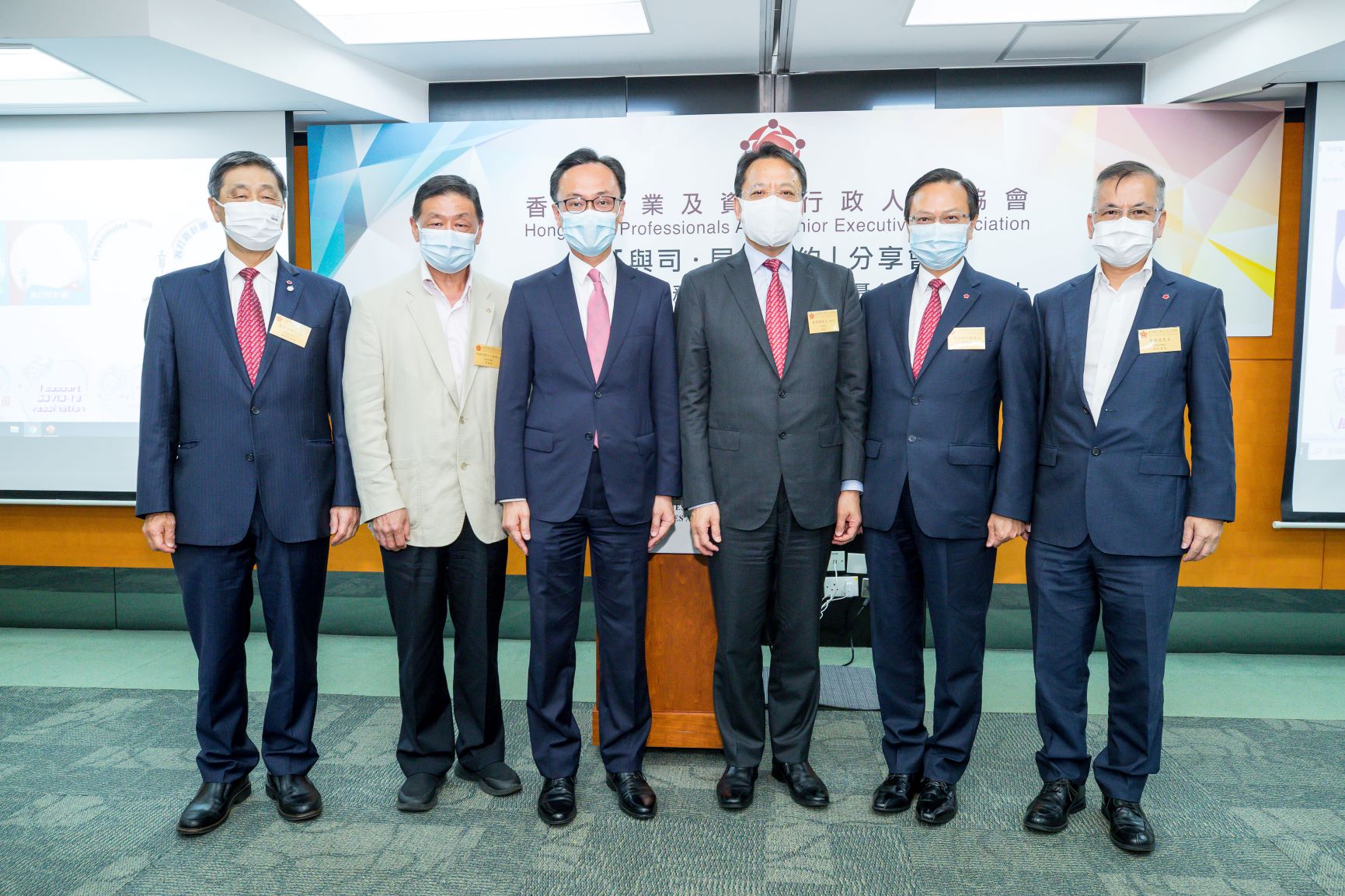 聶德權(左三)擔任主講嘉賓,與黃偉雄(右三)及前會長胡曉明(左二)、陳紹雄(右二)、李鏡波(右一)、常務副會長潘燊昌(左一)合照。