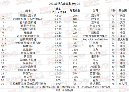 前20名中,有6位來自中國。碧桂園40歲的楊惠妍以2150億元人民幣的財富蟬聯中國女首富,位列全球女企業家第六。