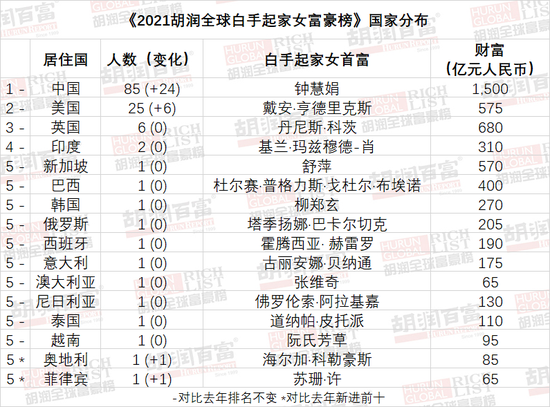 5月19日消息,胡潤研究院今日發布《2021胡潤全球白手起家女富豪榜》,列出了全球白手起家的十億美金女企業家。其中,中國擁有全球三分之二的最成功女企業家,是美國的3倍多。