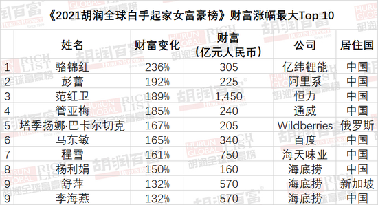 翰森製藥60歲的鍾慧娟財富上漲53%,以1500億元連續第二年成為全球最成功女企業家,大概每天進賬4.1億元(約4.9億港元);紡織材料製造商恒力54歲的范紅衛財富增至去年三倍,以1450億元排名第二;龍湖地產57歲的吳亞軍財富雖上漲21%至1100億元,但排名下降一位至第三。