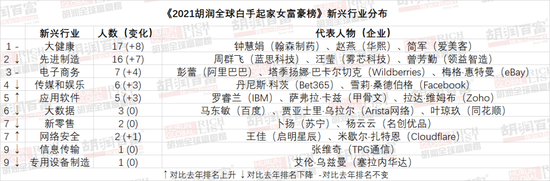 新興行業上榜企業家中,來自大健康和先進製造業的人數最多,分別有17位和16位,比去年增加了8位和7位。排在大健康行業首位的是翰森製藥的鍾慧娟,其次是華熙的趙燕。排在先進製造業首位的是藍思科技的周群飛,其次是霧芯科技的汪瑩。