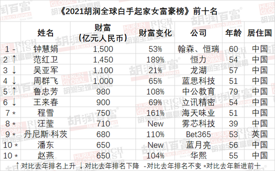 前十中5位新面孔:海天味業的程雪、霧芯科技的汪瑩、英國博彩網站Bet365的丹尼斯·科茨(Denise Coates)、藍月亮的潘東和華熙的趙燕。平均年齡55歲,比去年小7歲。