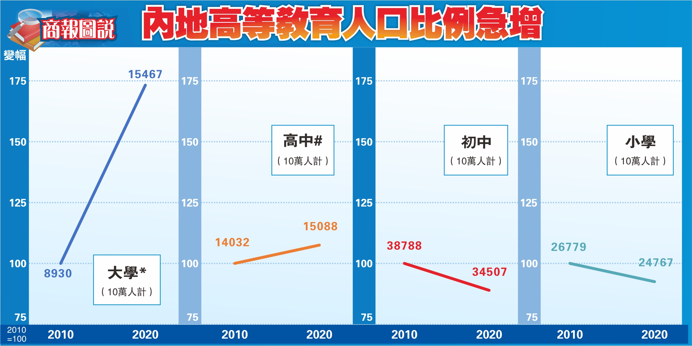 具大學文化程度的人口增至2.1836億人。與2010年相比,以每10萬人口衡量,即從8930人增至15467人,增幅高達73.2%,另外高中程度增幅亦有7.53%;至於初中和小學程度的,則分別下降11.04%和7.51%。